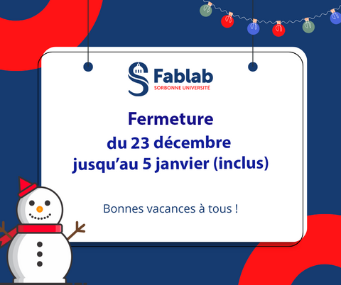 Fermeture FABLAB vacances de Noël Fermeture du FABLAB du 23 décembre 2024 jusqu’au 5 janvier 2025 (inclus) 🎄 ✨.